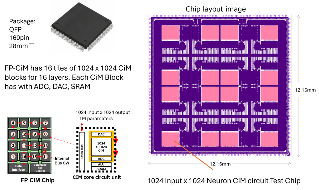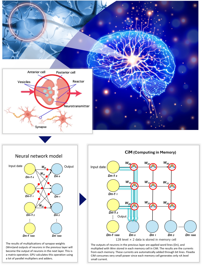 Different from large scale digital circuit calculation in GPU, CiM calculates product sum calculations in matrix operation in analog way by using analog data stored in flash memory cells and analog inputs applied from word lines. This way is very simple and super low power (about 1/1000 of GPU), lower cost. There are several companies that are developing CiM technology, but no other companies achieved better low power and calculation precision than Floadia because of special flash memory technology. Analog calculation contains errors, but neural networks have mechanisms to cancel errors like human brain. Calculations at human brain contains a lot of errors, but human brain algorithms have mechanisms to cancel errors.